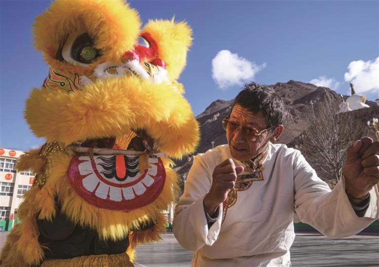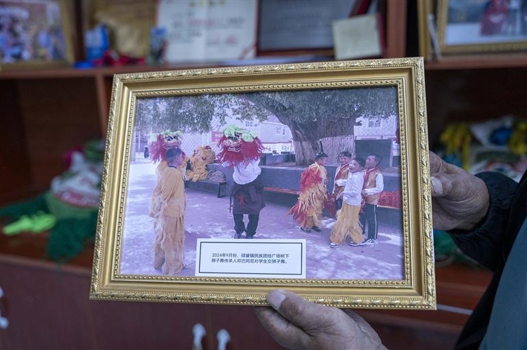在碩督鎮(zhèn)生活期間,這位商人將舞獅技藝毫無保留地傳授給子孫。從此,舞獅技藝在碩督鎮(zhèn)有了傳承人。歷經數(shù)代薪火相傳,這門技藝在古鎮(zhèn)深深扎根,如今已傳到第五代鄧巴阿尼、第六代洛松江村手中。