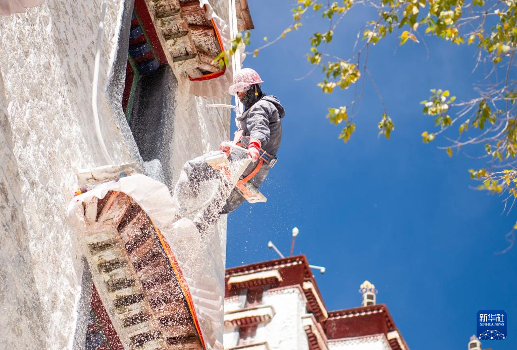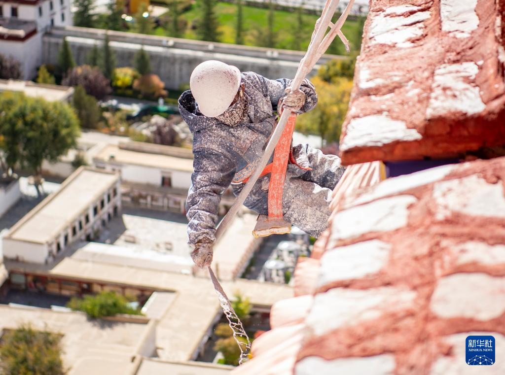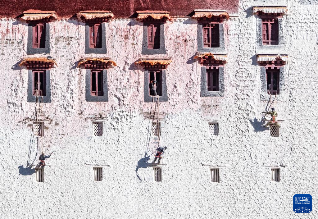 近日,西藏布達(dá)拉宮迎來一年一度的粉刷“美容”。工作人員和志愿者將粉刷材料按比例混合,經(jīng)過濾后對布達(dá)拉宮墻體進(jìn)行噴涂,讓建筑更加美觀。