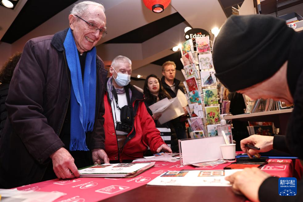 1月26日,在法國巴黎舉行的發(fā)行儀式上,郵票設計者陳江洪為當?shù)丶]愛好者簽字留念。新華社記者 高靜 攝